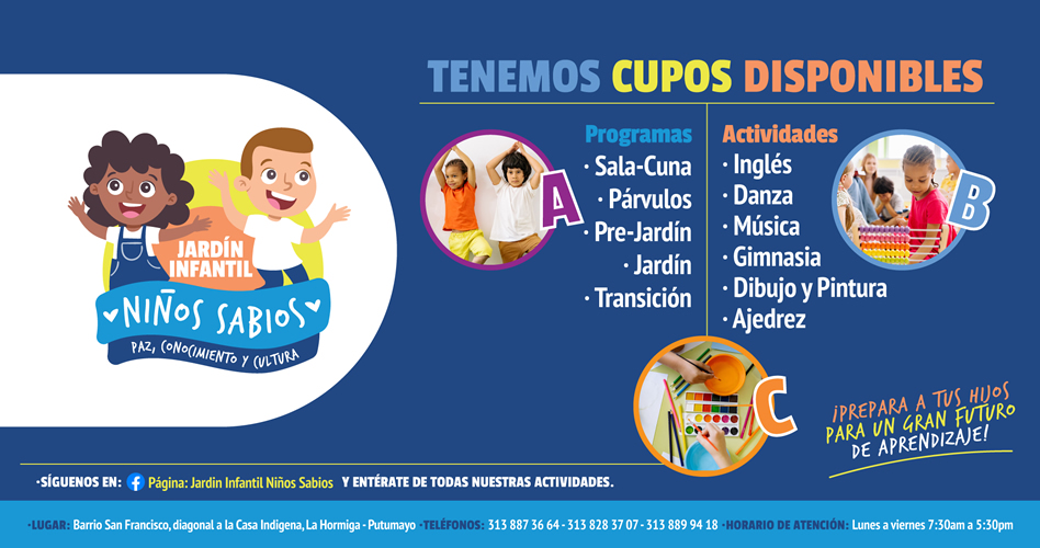 Teléfonos: (+57) 3138873664 – (+57) 313 828 37 07 – (+57) 313 889 94 18 | – Correo Electrónico: jardinfantilsabios@gmail.com | Dirección: Barrio San Francisco, diagonal a La Casa Indígena, Carrera 2A # 7A – 38 | La Hormiga | Putumayo | Colombia